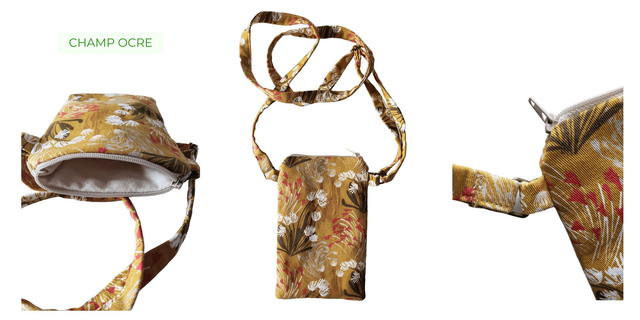 Cette sacoche à bandoulière vous permettra d’avoir toujours votre téléphone sur vous. Finement molletonnée pour le protéger d’éventuels coups, elle est constituée d’un tissu d’ameublement épais à l’extérieur et d’une doublure assortie. Ces deux tissus sont 100 % coton (sauf Poissons multicolores : mélange de coton et polyester).